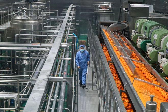 工厂里,又是另一番忙碌景象。湖南山之良科技有限公司,轰隆的鼓泡清洗机中,圆润饱满的脐橙在清凉的水流中翻滚,更显鲜艳明亮。顺着湖南山之良科技有限公司(以下简称“山之良”)董事长戴润平的视线,看向榨汁区域,满目橙黄。一分钟的时间里,2500个果子就已被鲜榨成汁。