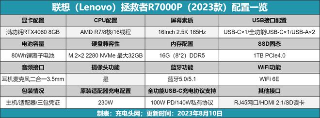 开篇先向大家介绍一下2023款联想拯救者R7000P R7-7840H系列笔记本的充电配置。笔记本搭载官方标注容量为80Wh的4芯锂离子电池,配备一个230W原装适配器,笔记本左侧USB-C接口支持最大140W私有协议充电以及最大100W PD协议充电。